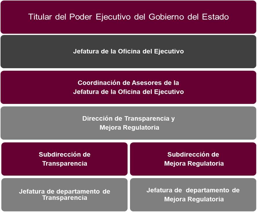 El presente Organigrama establece la estructura actual de la Dirección de Transparencia y Mejora Regulatoria adscrita a la Coordinación de Asesores de la Jefatura de la Oficina del Ejecutivo, tiene su fundamento de conformidad al Reglamento Interior de la Jefatura de la Oficina del Ejecutivo publicado el 31 de julio de 2022 en Boletín Oficial del Gobierno del Estado de Baja California Sur N°45. El cual fue Reformado el pasado el 31 de diciembre de 2022, reformada publicada en Boletín Oficial del Gobierno del Estado de Baja California Sur N°79.